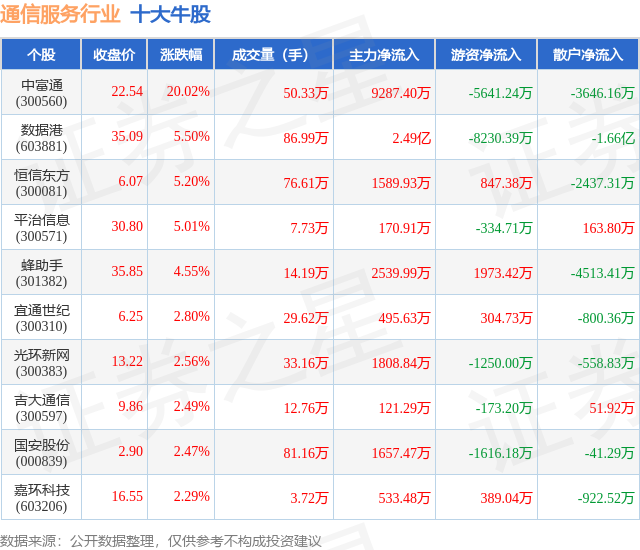 个股表现方面,通信服务行业当日领涨股为中富通(300560),该股当日报收22.54,上涨20.02%,成交量50.33万,主力资金净流入9287.4万元。数据港(603881)以上涨5.5%紧随其后,该股当日成交量86.99万,主力资金净流入2.49亿元。除此之外,恒信东方(300081)、平治信息(300571)、蜂助手(301382)均进入当日牛股之列。具体个股列表见下表: