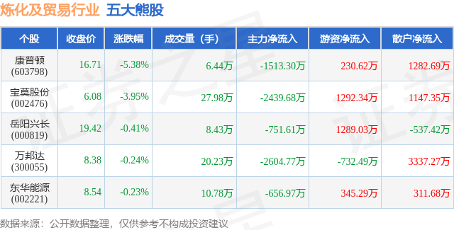 个股表现方面,炼化及贸易行业当日领跌股为康普顿(603798),该股当日报收16.71,下跌5.38%,成交量6.44万,主力资金净流出1513.3万元。宝莫股份(002476)以下跌3.95%紧随其后,该股当日成交量27.98万,主力资金净流出2439.68万元。除此之外,岳阳兴长(000819)、万邦达(300055)、东华能源(002221)均进入当日熊股之列。具体个股列表见下表: