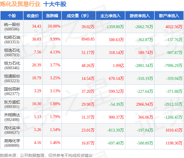 个股表现方面,炼化及贸易行业当日领涨股为统一股份(600506),该股当日报收34.43,上涨10.0%,成交量39.02万,主力资金净流出1359.8万元。和顺石油(603353)以上涨9.99%紧随其后,该股当日成交量8950.0,主力资金净流入500.63万元。除此之外,恒逸石化(000703)、恒力石化(600346)、恒通股份(603223)均进入当日牛股之列。具体个股列表见下表: