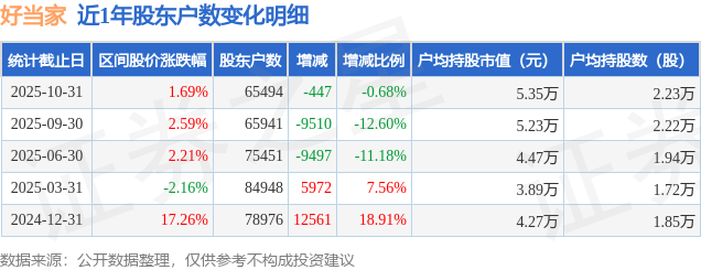 从股价来看,2025年9月30日至2025年10月31日,好当家区间涨幅为1.69%,在此期间股东户数减少447.0户,减幅为0.68%。