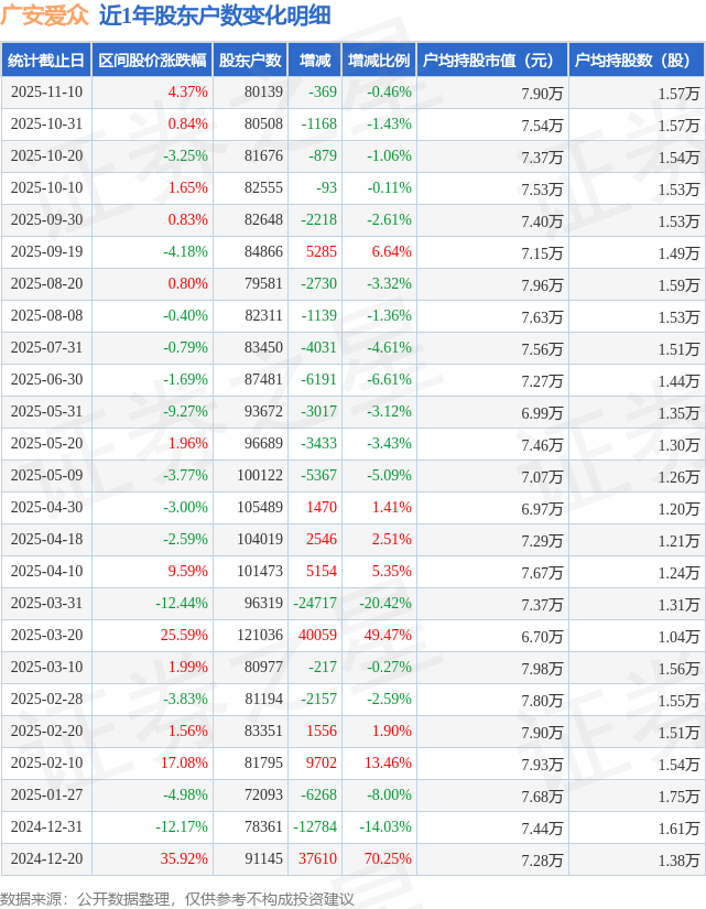 从股价来看,2025年10月31日至2025年11月10日,广安爱众区间涨幅为4.37%,在此期间股东户数减少369.0户,减幅为0.46%。