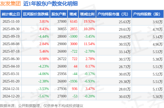 从股价来看,2025年9月30日至2025年11月10日,友发集团区间涨幅为3.81%,在此期间股东户数增加6145.0户,增幅为19.92%。