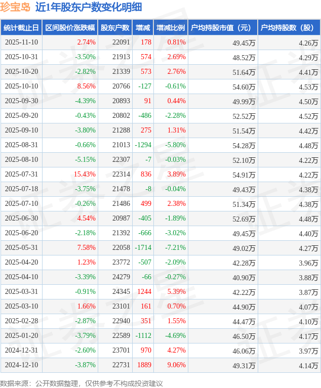 从股价来看,2025年10月31日至2025年11月10日,珍宝岛区间涨幅为2.74%,在此期间股东户数增加178.0户,增幅为0.81%。