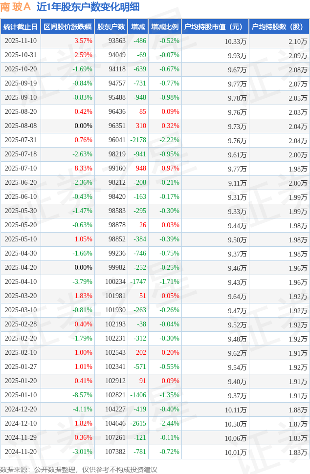 从股价来看,2025年10月31日至2025年11月10日,南 玻A区间涨幅为3.57%,在此期间股东户数减少486.0户,减幅为0.52%。