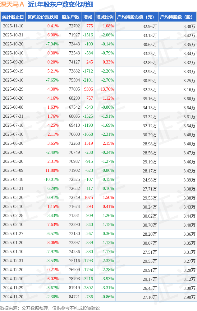 从股价来看,2025年10月31日至2025年11月10日,深天马A区间涨幅为0.41%,在此期间股东户数增加775.0户,增幅为1.08%。