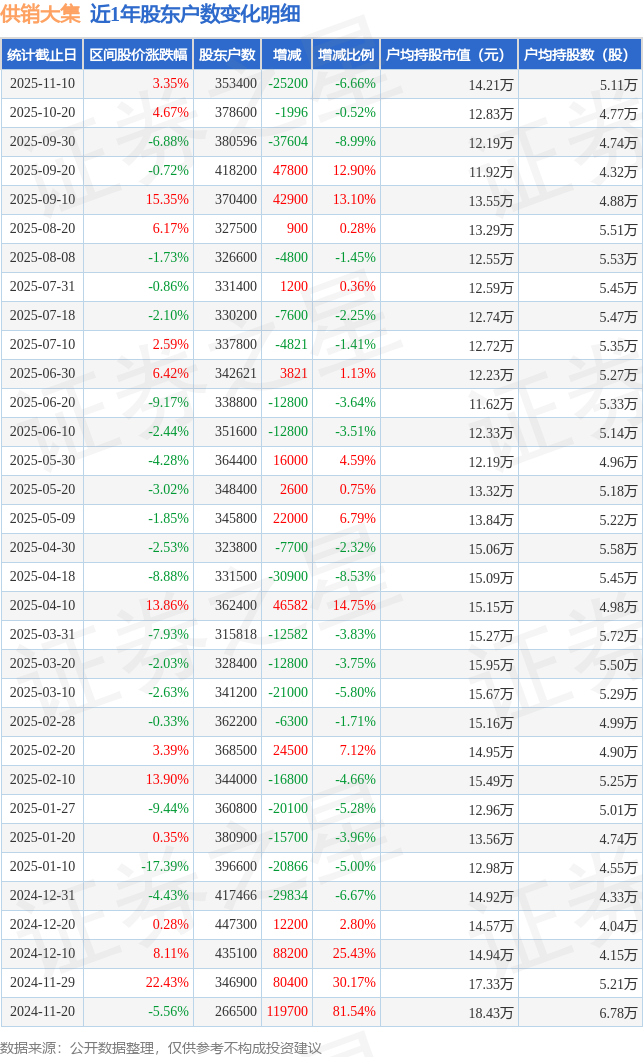 从股价来看,2025年10月20日至2025年11月10日,供销大集区间涨幅为3.35%,在此期间股东户数减少2.52万户,减幅为6.66%。
