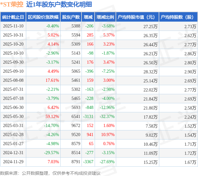 从股价来看,2025年10月31日至2025年11月10日,*ST荣控区间跌幅为0.4%,在此期间股东户数减少206.0户,减幅为3.68%。