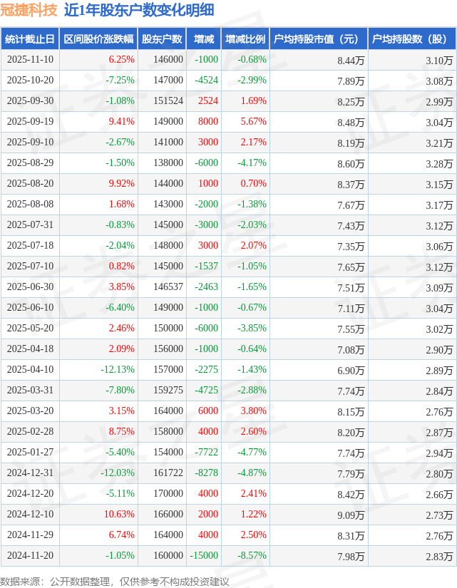 从股价来看,2025年10月20日至2025年11月10日,冠捷科技区间涨幅为6.25%,在此期间股东户数减少1000.0户,减幅为0.68%。