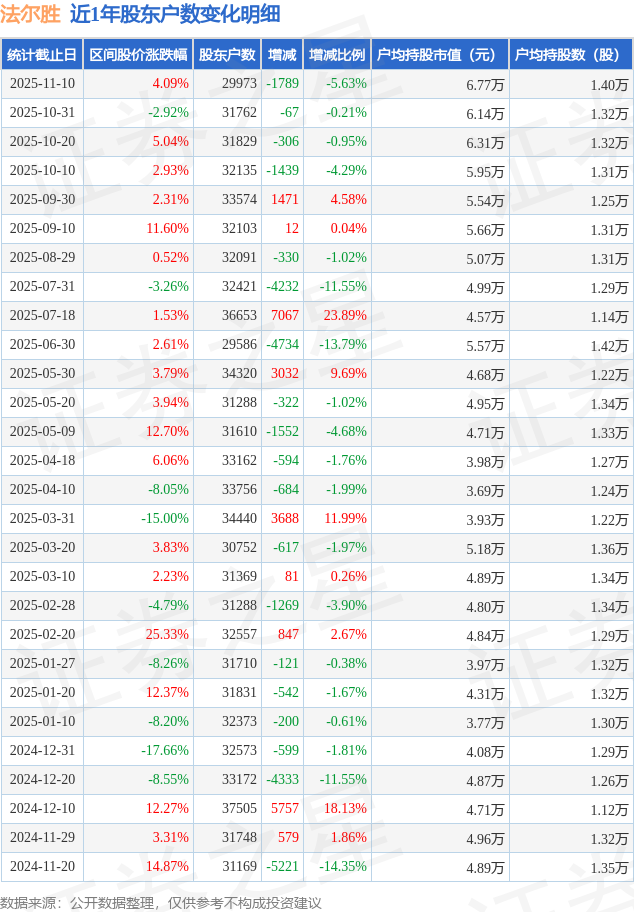 从股价来看,2025年10月31日至2025年11月10日,法尔胜区间涨幅为4.09%,在此期间股东户数减少1789.0户,减幅为5.63%。