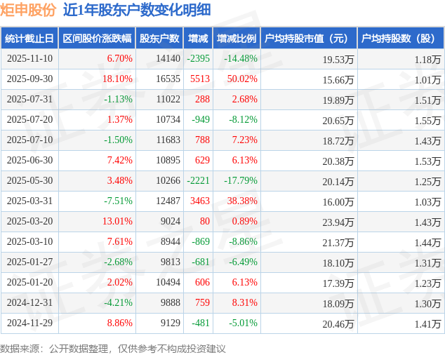 从股价来看,2025年9月30日至2025年11月10日,炬申股份区间涨幅为6.7%,在此期间股东户数减少2395.0户,减幅为14.48%。