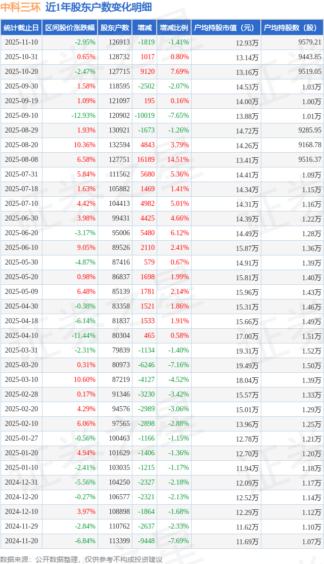从股价来看,2025年10月31日至2025年11月10日,中科三环区间跌幅为2.95%,在此期间股东户数减少1819.0户,减幅为1.41%。