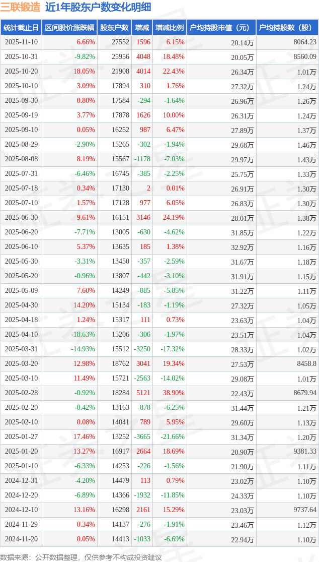 从股价来看,2025年10月31日至2025年11月10日,三联锻造区间涨幅为6.66%,在此期间股东户数增加1596.0户,增幅为6.15%。