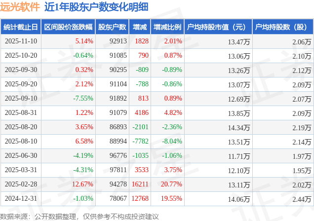 从股价来看,2025年10月20日至2025年11月10日,远光软件区间涨幅为5.14%,在此期间股东户数增加1828.0户,增幅为2.01%。