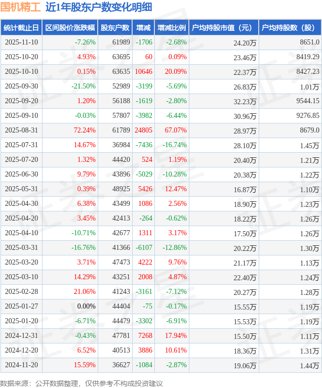 从股价来看,2025年10月24日至2025年11月10日,国机精工区间跌幅为7.26%,在此期间股东户数减少1706.0户,减幅为2.68%。