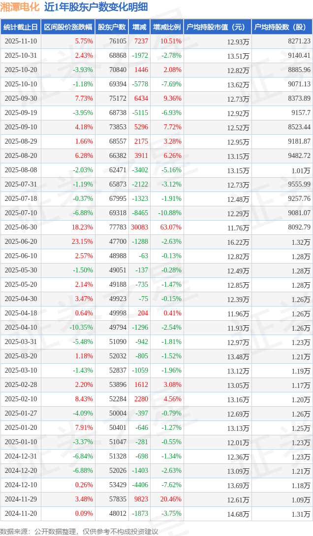 从股价来看,2025年10月31日至2025年11月10日,湘潭电化区间涨幅为5.75%,在此期间股东户数增加7237.0户,增幅为10.51%。