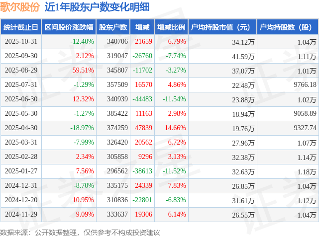 证券之星消息,近日歌尔股份披露,截至2025年10月31日公司股东户数为34.07万户,较9月30日增加2.17万户,增幅为6.79%。户均持股数量由上期的1.11万股减少至1.04万股,户均持股市值为34.12万元。