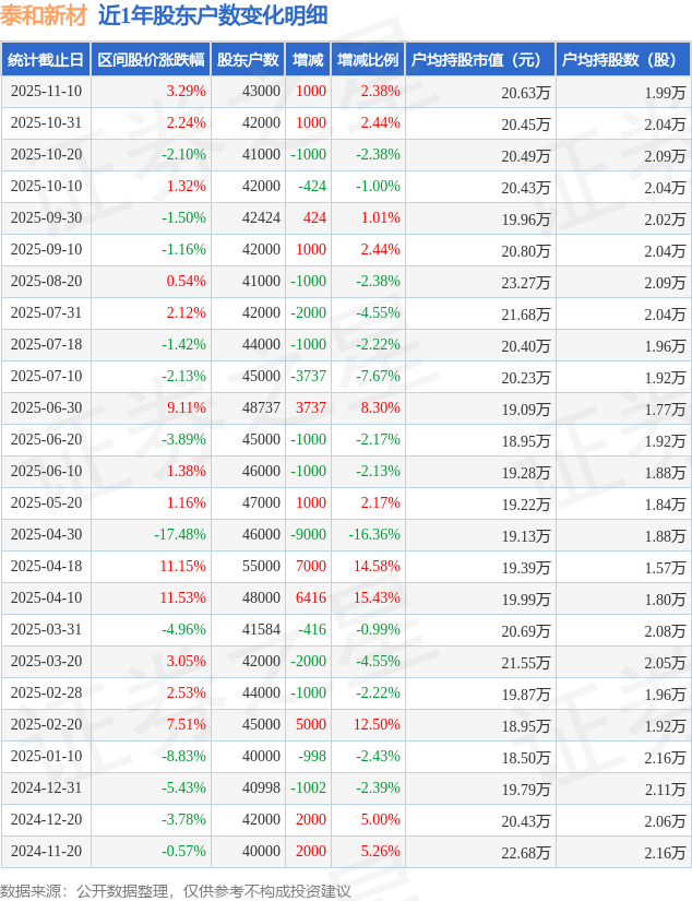从股价来看,2025年10月31日至2025年11月10日,泰和新材区间涨幅为3.29%,在此期间股东户数增加1000.0户,增幅为2.38%。