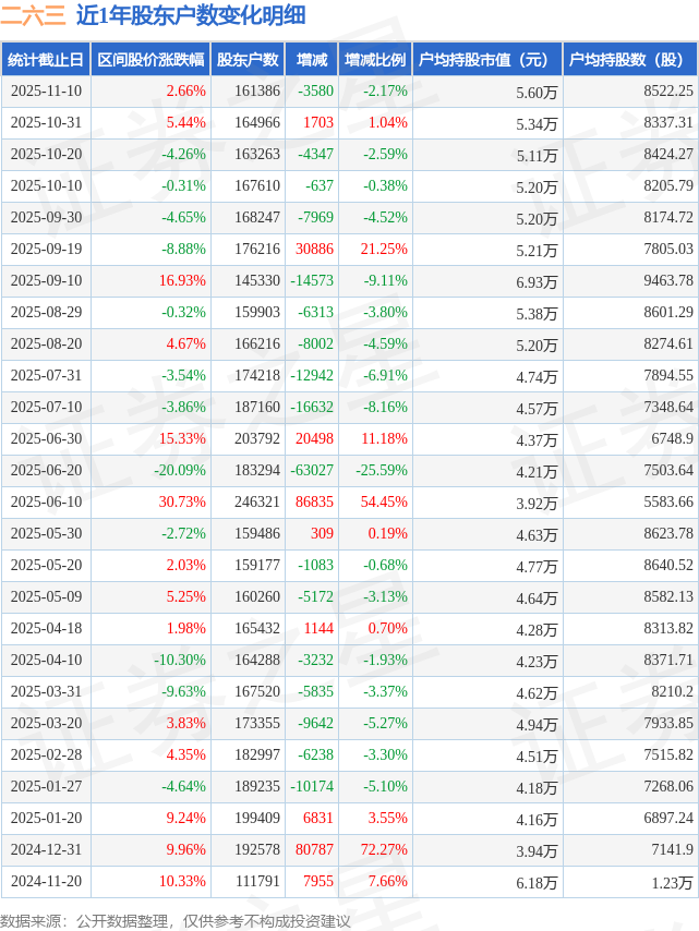 从股价来看,2025年10月31日至2025年11月10日,二六三区间涨幅为2.66%,在此期间股东户数减少3580.0户,减幅为2.17%。