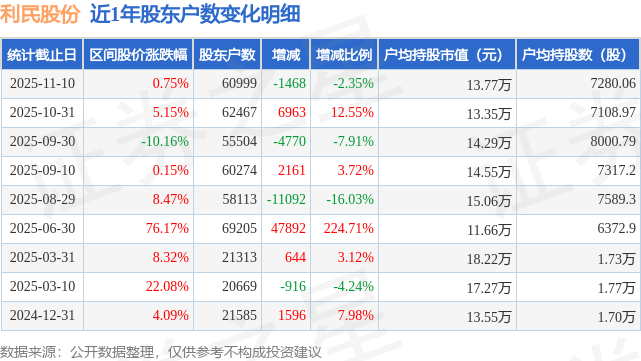 从股价来看,2025年10月31日至2025年11月10日,利民股份区间涨幅为0.75%,在此期间股东户数减少1468.0户,减幅为2.35%。