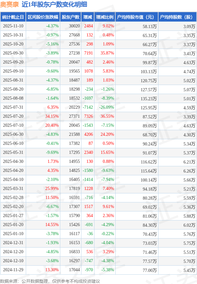证券之星消息,近日奥赛康披露,截至2025年11月10日公司股东户数为3.0万户,较10月20日增加2484.0户,增幅为9.02%。户均持股数量由上期的3.35万股减少至3.09万股,户均持股市值为58.13万元。