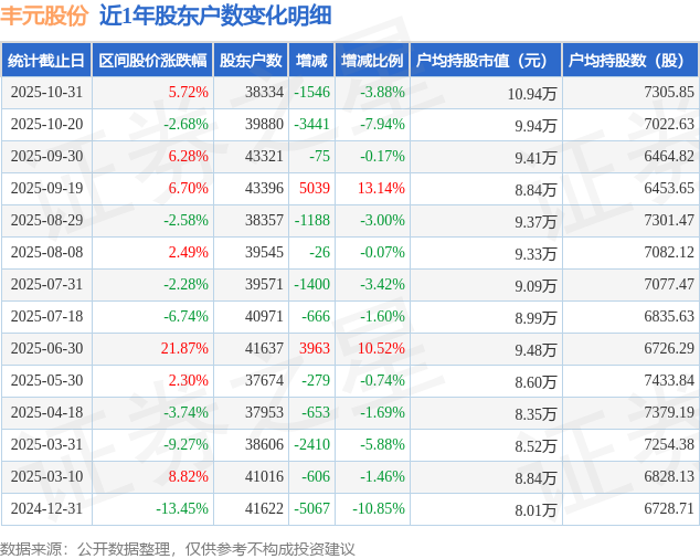 从股价来看,2025年10月20日至2025年10月31日,丰元股份区间涨幅为5.72%,在此期间股东户数减少1546.0户,减幅为3.88%。