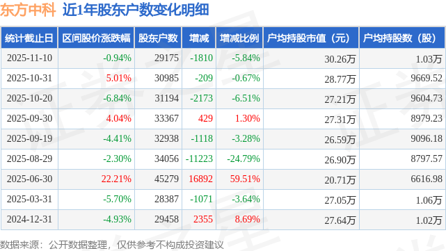 证券之星消息,近日东方中科披露,截至2025年11月10日公司股东户数为2.92万户,较10月31日减少1810.0户,减幅为5.84%。户均持股数量由上期的9670.0股增加至1.03万股,户均持股市值为30.26万元。