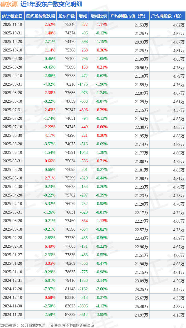 从股价来看,2025年10月31日至2025年11月10日,碧水源区间涨幅为2.52%,在此期间股东户数增加872.0户,增幅为1.17%。