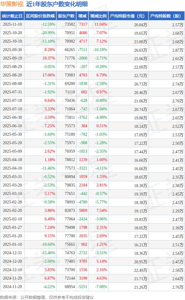 从股价来看,2025年9月30日至2025年11月10日,华策影视区间跌幅为12.59%,在此期间股东户数增加7317.0户,增幅为11.04%。