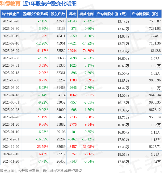 从股价来看,2025年9月30日至2025年10月20日,科德教育区间跌幅为7.15%,在此期间股东户数减少1543.0户,减幅为3.42%。