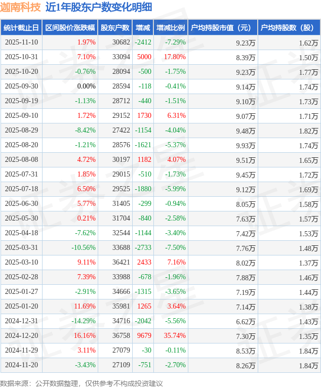 从股价来看,2025年10月31日至2025年11月10日,迦南科技区间涨幅为1.97%,在此期间股东户数减少2412.0户,减幅为7.29%。