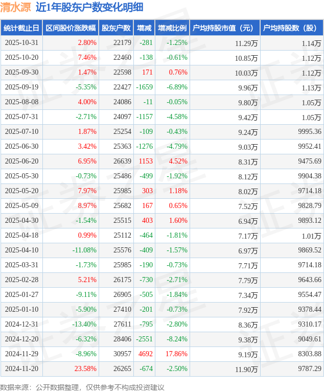 从股价来看,2025年10月20日至2025年10月31日,清水源区间涨幅为2.8%,在此期间股东户数减少281.0户,减幅为1.25%。