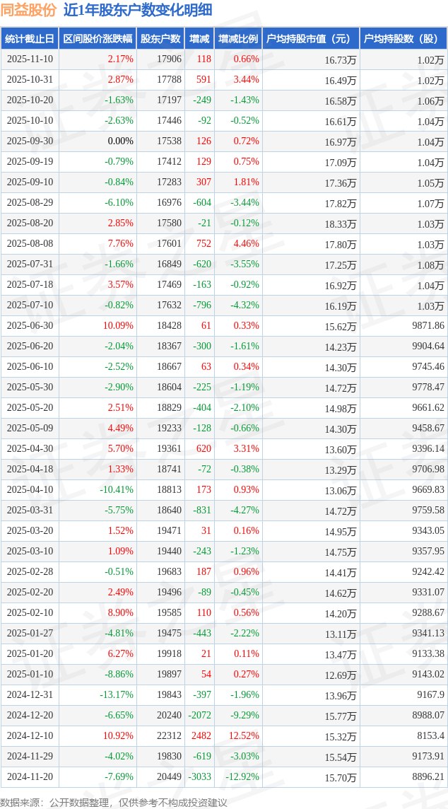 从股价来看,2025年10月31日至2025年11月10日,同益股份区间涨幅为2.17%,在此期间股东户数增加118.0户,增幅为0.66%。