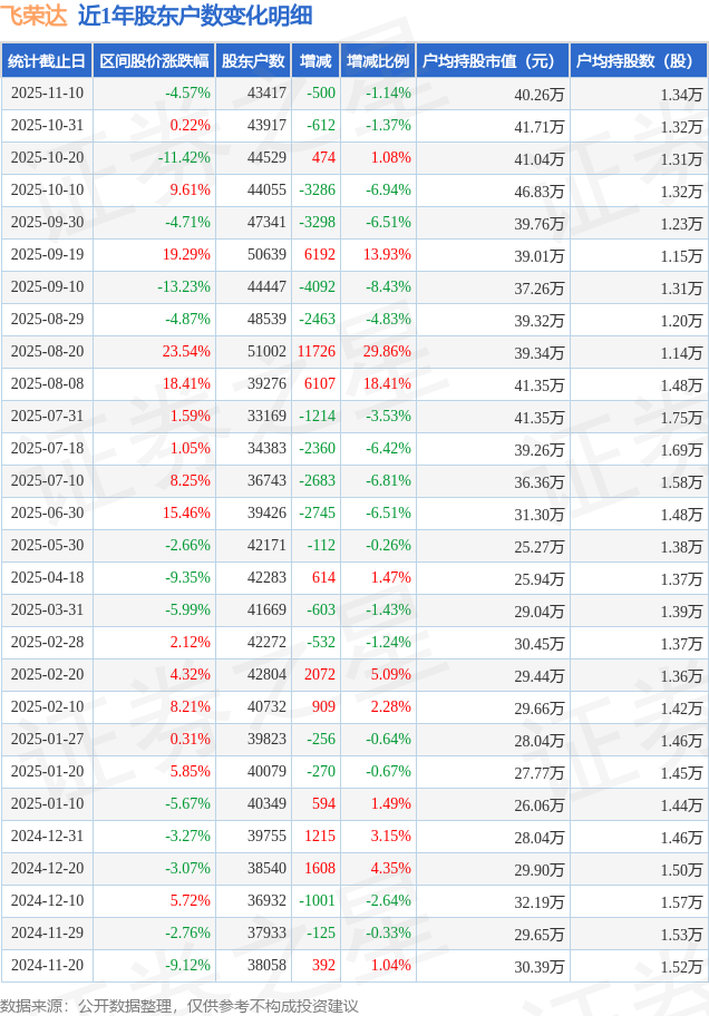 从股价来看,2025年10月31日至2025年11月10日,飞荣达区间跌幅为4.57%,在此期间股东户数减少500.0户,减幅为1.14%。