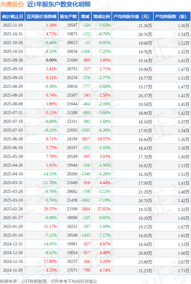 证券之星消息,近日光莆股份披露,截至2025年11月10日公司股东户数为1.95万户,较10月31日减少324.0户,减幅为1.63%。户均持股数量由上期的1.54万股增加至1.56万股,户均持股市值为21.36万元。