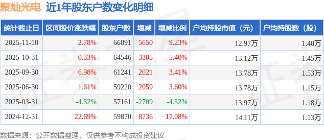 从股价来看,2025年9月30日至2025年11月10日,聚灿光电区间涨幅为2.78%,在此期间股东户数增加5650.0户,增幅为9.23%。