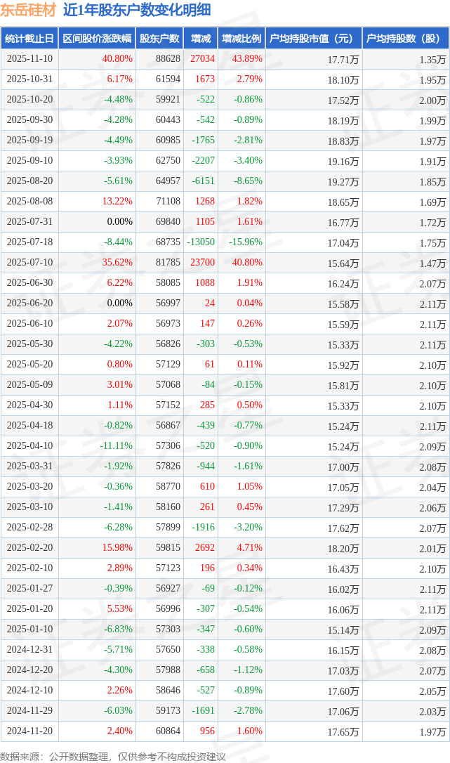 从股价来看,2025年10月31日至2025年11月10日,东岳硅材区间涨幅为40.8%,在此期间股东户数增加2.7万户,增幅为43.89%。