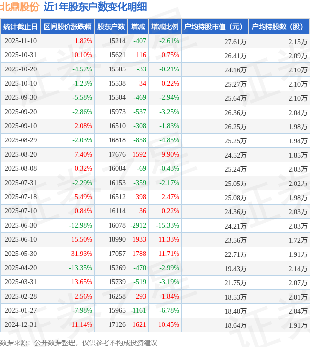 从股价来看,2025年10月31日至2025年11月10日,北鼎股份区间涨幅为1.82%,在此期间股东户数减少407.0户,减幅为2.61%。