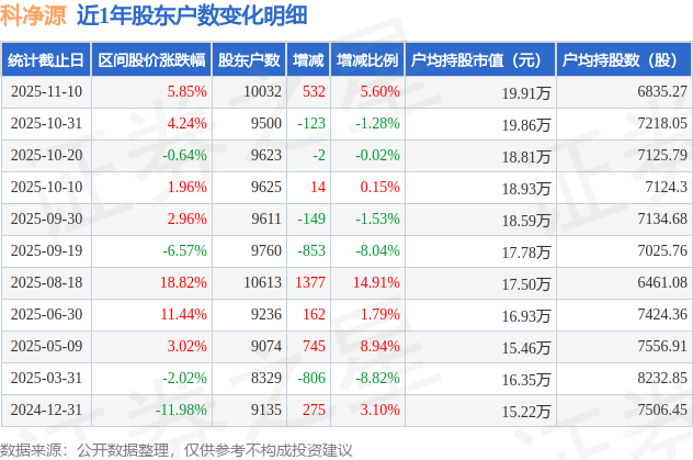 从股价来看,2025年10月31日至2025年11月10日,科净源区间涨幅为5.85%,在此期间股东户数增加532.0户,增幅为5.6%。
