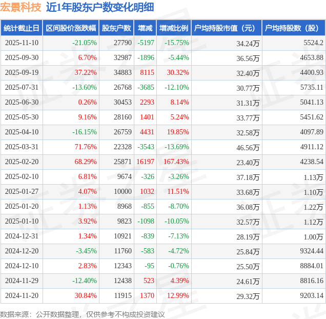 从股价来看,2025年9月30日至2025年11月10日,宏景科技区间跌幅为21.05%,在此期间股东户数减少5197.0户,减幅为15.75%。