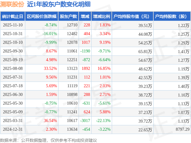 证券之星消息,近日溯联股份披露,截至2025年11月10日公司股东户数为1.27万户,较10月31日增加228.0户,增幅为1.83%。户均持股数量由上期的1.25万股减少至1.22万股,户均持股市值为39.51万元。