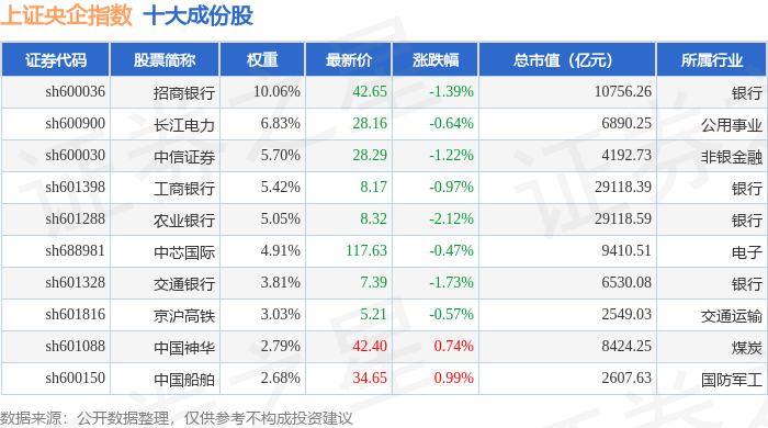证券之星消息,11月17日,上证央企(000042)指数报收于1839.64点,跌0.81%,成交655.18亿元,换手率0.29%。当日该指数成份股中,上涨的有9家,中国软件以2.2%的涨幅领涨,下跌的有38家,中国铝业以4.29%的跌幅领跌。