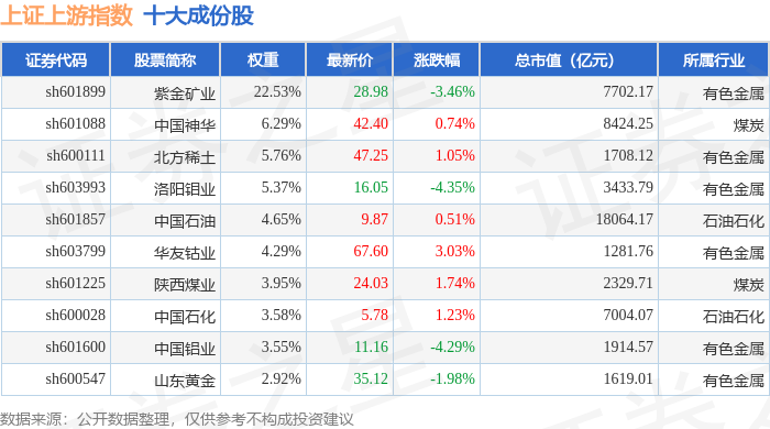 证券之星消息,11月17日,上证上游(000094)指数报收于4259.53点,跌1.01%,成交579.29亿元,换手率0.72%。当日该指数成份股中,上涨的有25家,西藏珠峰以3.42%的涨幅领涨,下跌的有20家,洛阳钼业以4.35%的跌幅领跌。