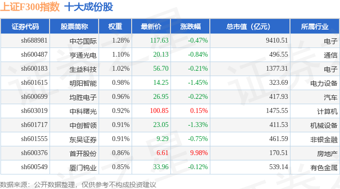 证券之星消息,11月17日,上证F300(000099)指数报收于9245.44点,跌0.25%,成交1523.2亿元,换手率1.49%。当日该指数成份股中,上涨的有97家,容百科技以20.0%的涨幅领涨,下跌的有196家,中孚实业以7.59%的跌幅领跌。