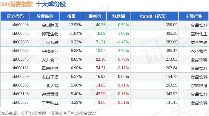 证券之星消息,11月17日,380消费(000108)指数报收于12626.26点,跌0.65%,成交43.36亿元,换手率1.12%。当日该指数成份股中,上涨的有9家,天味食品以1.76%的涨幅领涨,下跌的有10家,中粮糖业以3.79%的跌幅领跌。