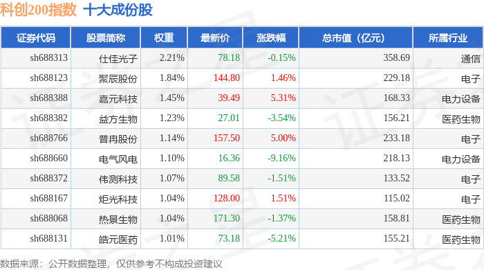 科创200(000699)指数十大成份股详情如下: