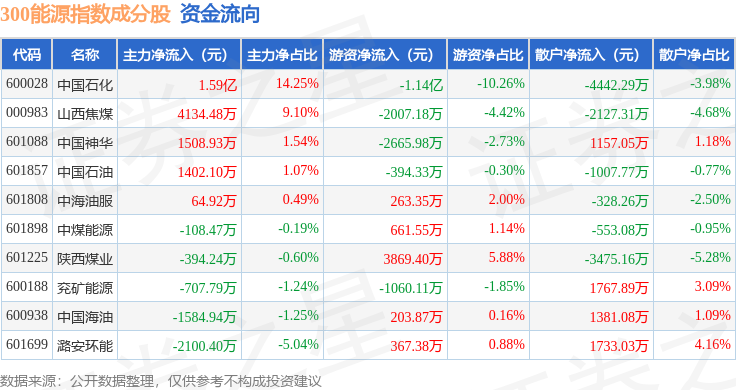 资金流向方面,300能源(000908)指数成份股当日主力资金净流入合计1.81亿元,游资资金净流出合计1.22亿元,散户资金净流出合计5894.83万元。成份股资金流向详情见下表: