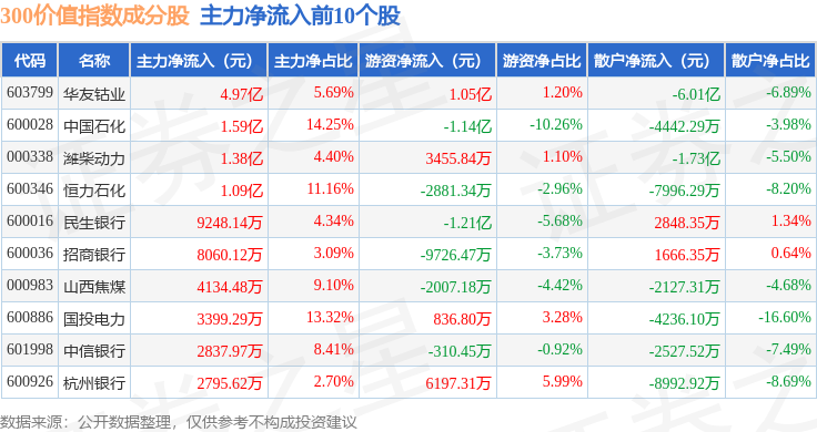 资金流向方面,300价值(000919)指数成份股当日主力资金净流出合计47.54亿元,游资资金净流入合计19.56亿元,散户资金净流入合计27.99亿元。成份股资金流向详情见下表: