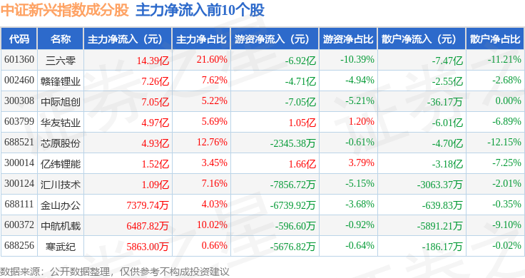 资金流向方面,中证新兴(000964)指数成份股当日主力资金净流出合计85.96亿元,游资资金净流入合计21.75亿元,散户资金净流入合计64.21亿元。成份股资金流向详情见下表: