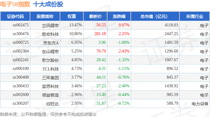 证券之星消息,11月17日,电子50(399281)指数报收于4301.27点,涨0.09%,成交459.46亿元,换手率1.65%。当日该指数成份股中,上涨的有25家,和而泰以5.06%的涨幅领涨,下跌的有25家,安克创新以2.53%的跌幅领跌。