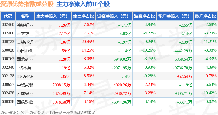 资金流向方面,资源优势(399319)指数成份股当日主力资金净流出合计26.27亿元,游资资金净流出合计6.45亿元,散户资金净流入合计32.71亿元。成份股资金流向详情见下表: